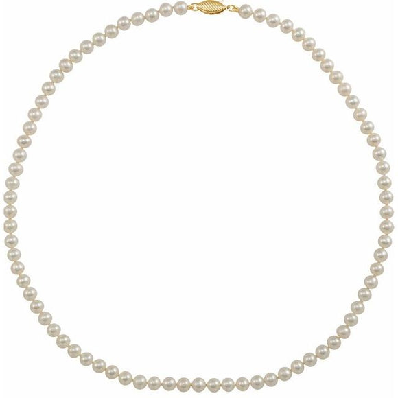 This strand of cultured white pearls is a beautiful, essential piece of any wardrobe. Each strand is strung with 4.5-5mm diameter white freshwater pearls and set with a 14K yellow gold clasp.
